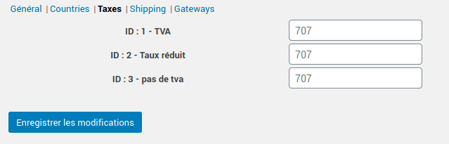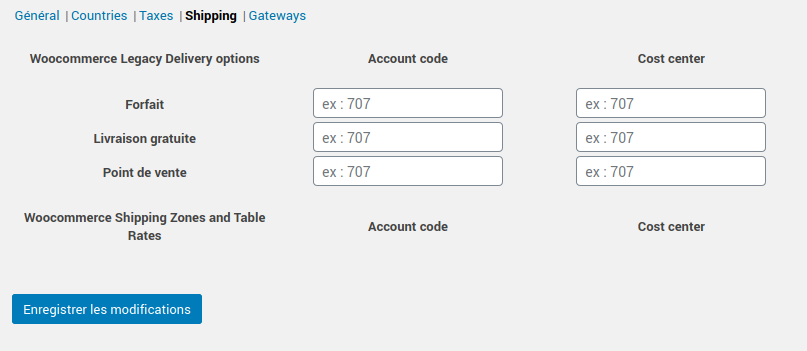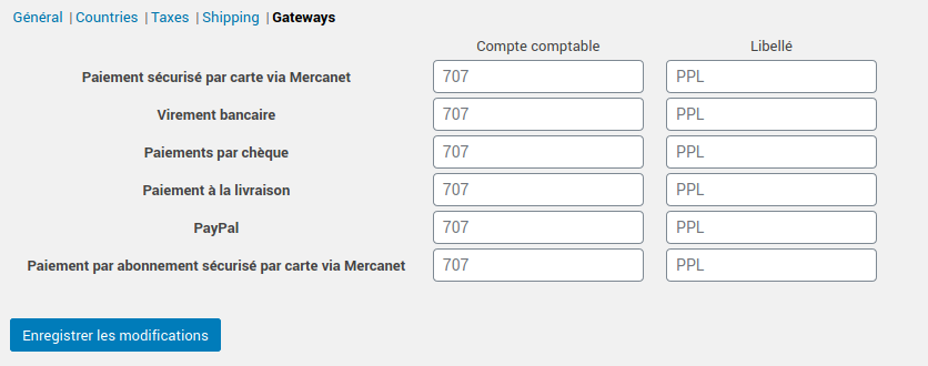 5 onglets sont proposés, pour vous permettre d’éditer les codes comptables spécifiques pour les différents paramètre que vous avez défini dans WooCommerce :