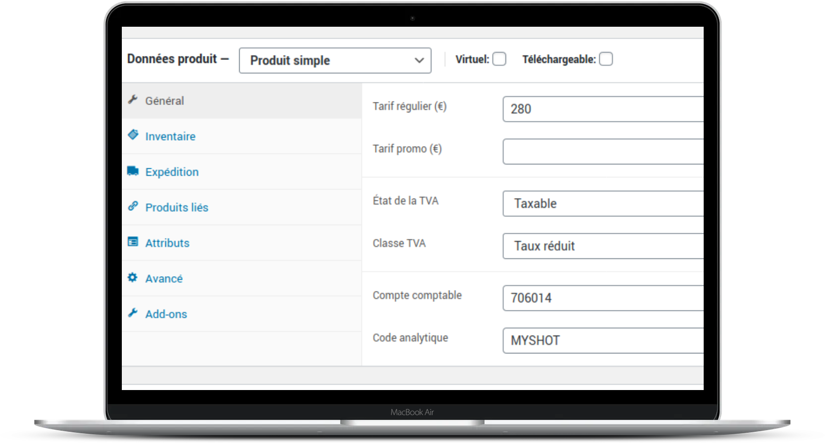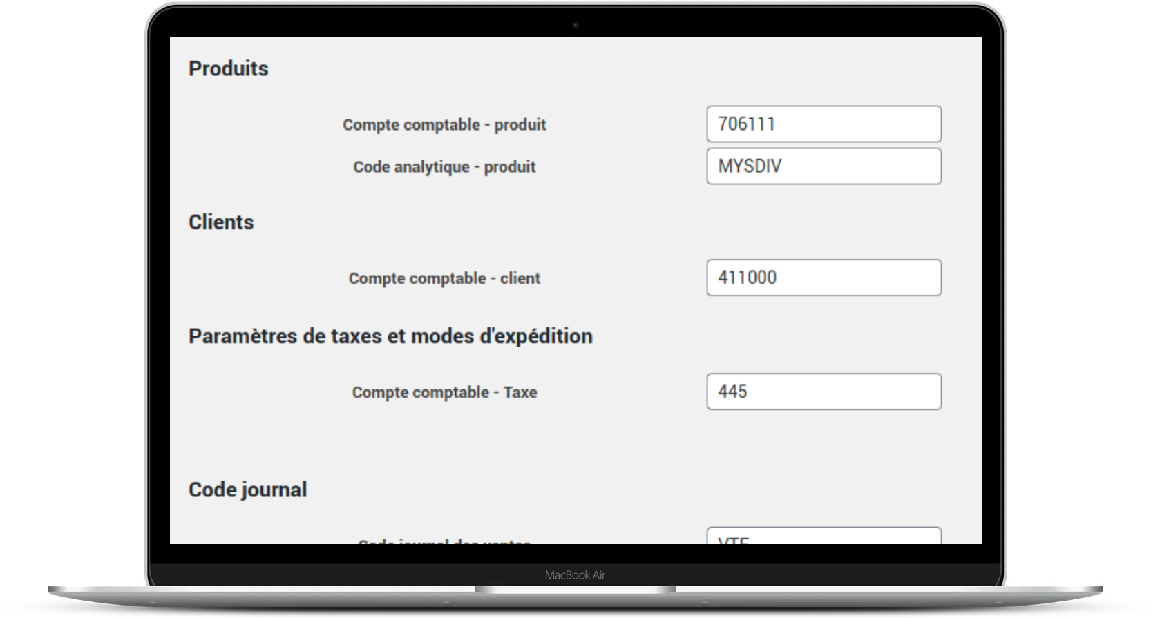 Besoin d’intégrer votre plan comptable détaillé ? Définissez des codes comptables détaillés pour chaque produit, les taxes, les frais de port, les modes de paiement, le livre comptable, les codes de comptabilité analytique.
